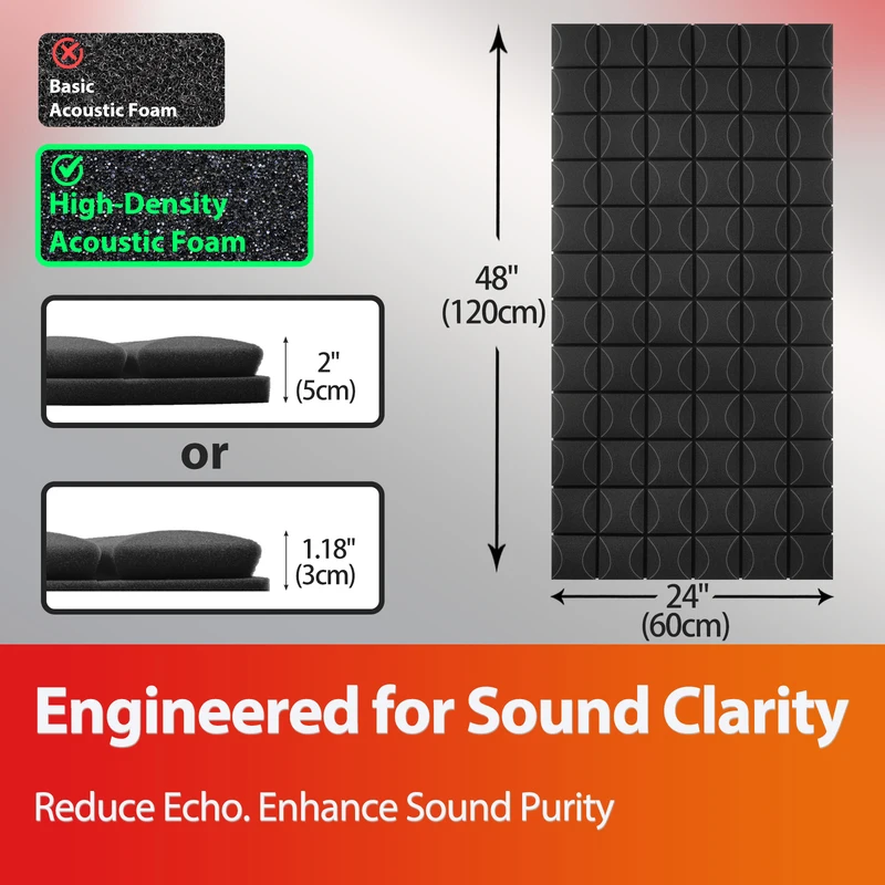 5 cm depth absorbs across a wide frequency range — effective on vocals, music, speech, and ambient noise